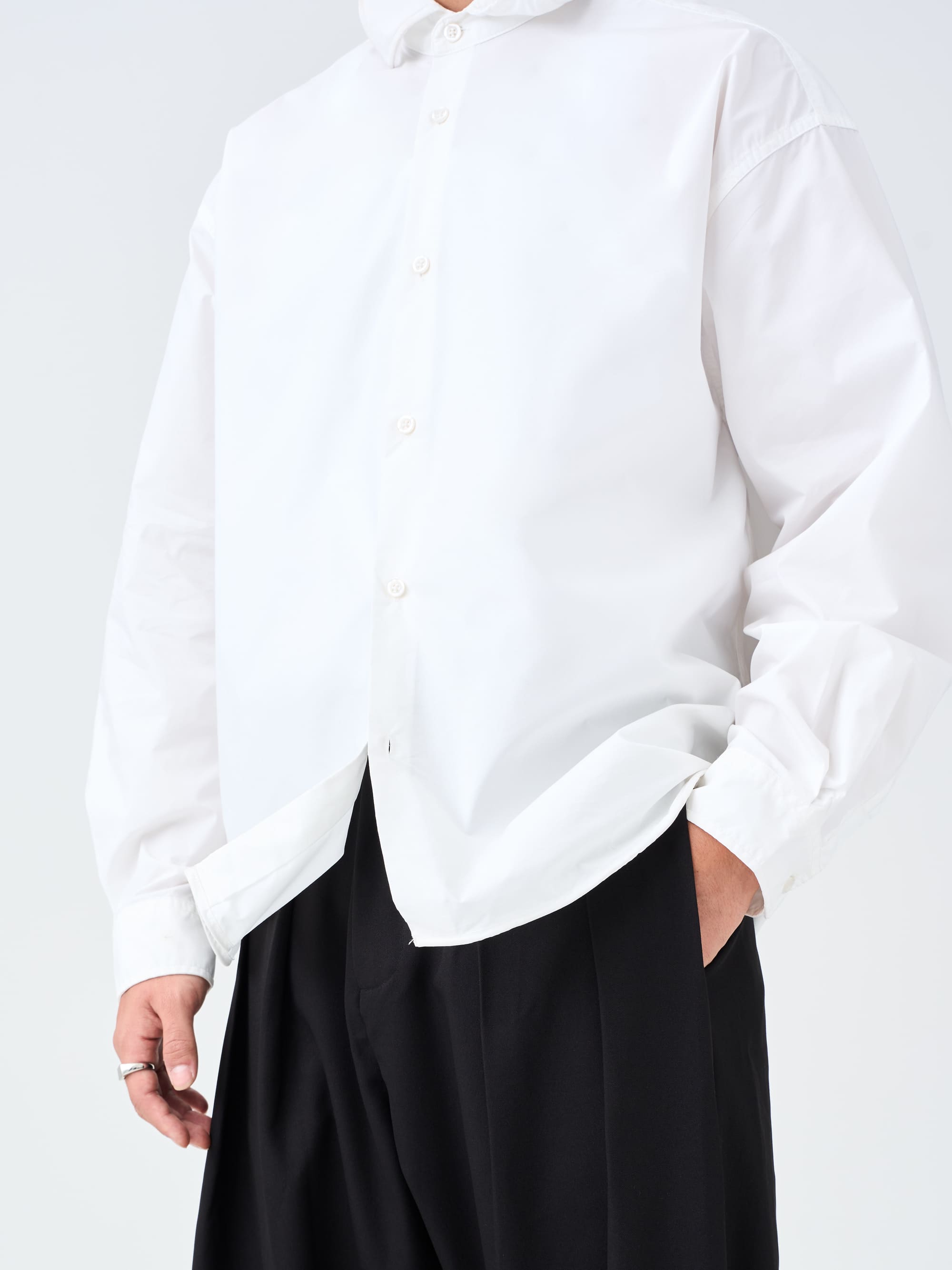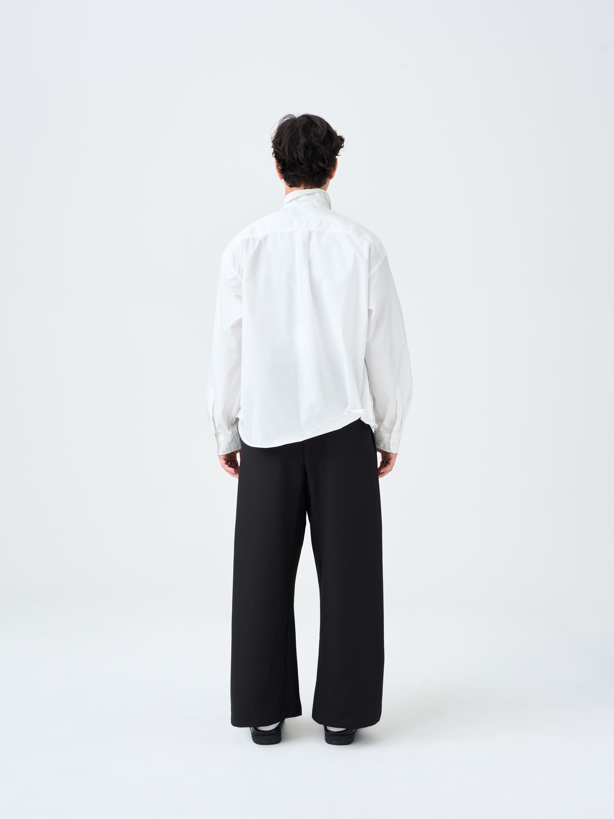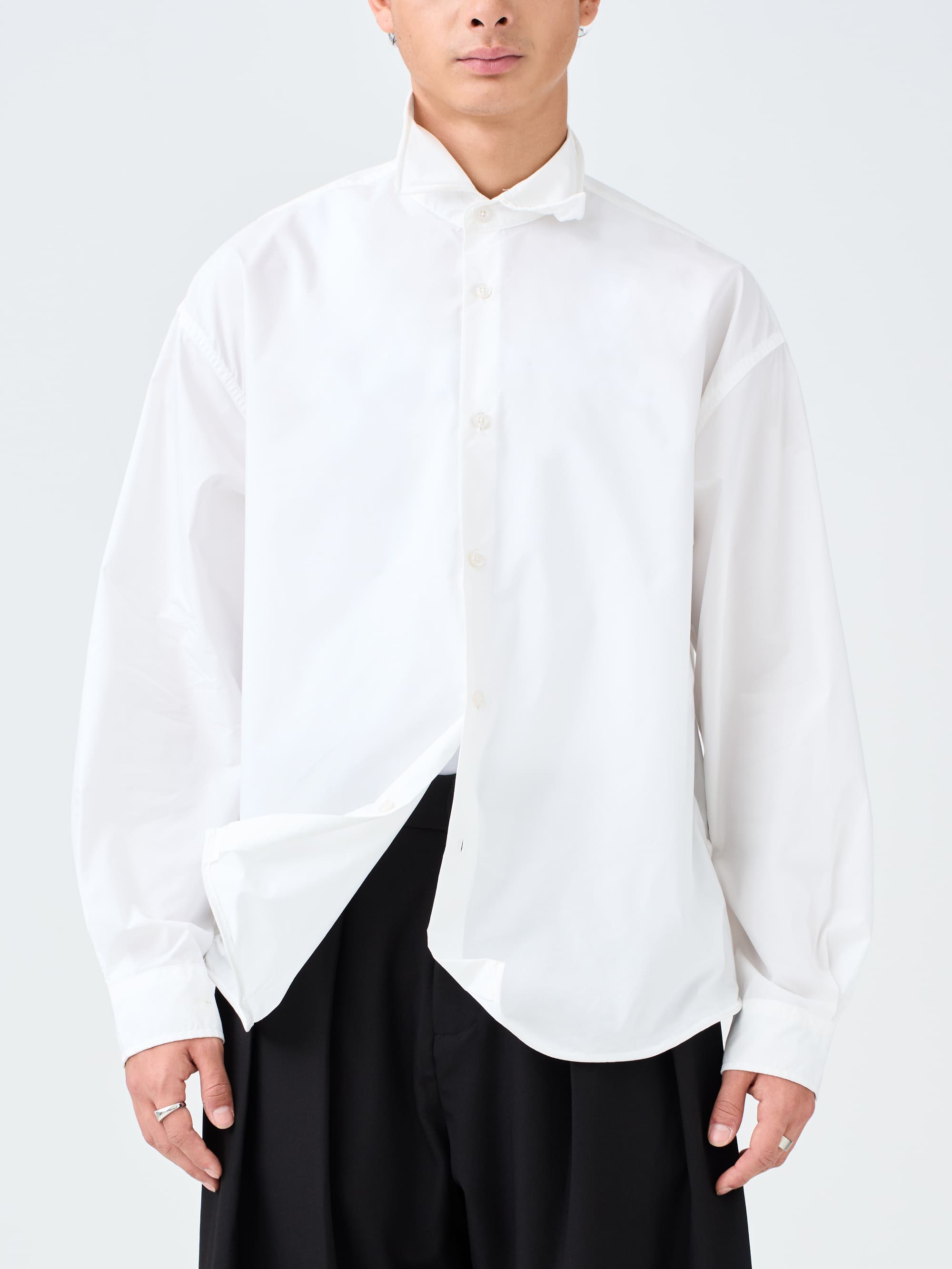 A refined white shirt defined by clean structure, quiet versatility, and integrated shaping wire at the hem and collar. Designed with relaxed proportions and minimal detailing, made for everyday wear.