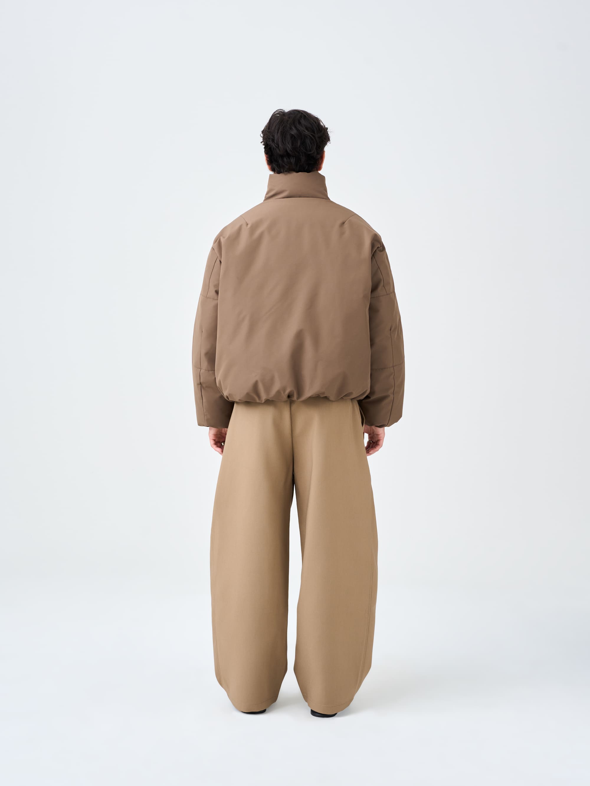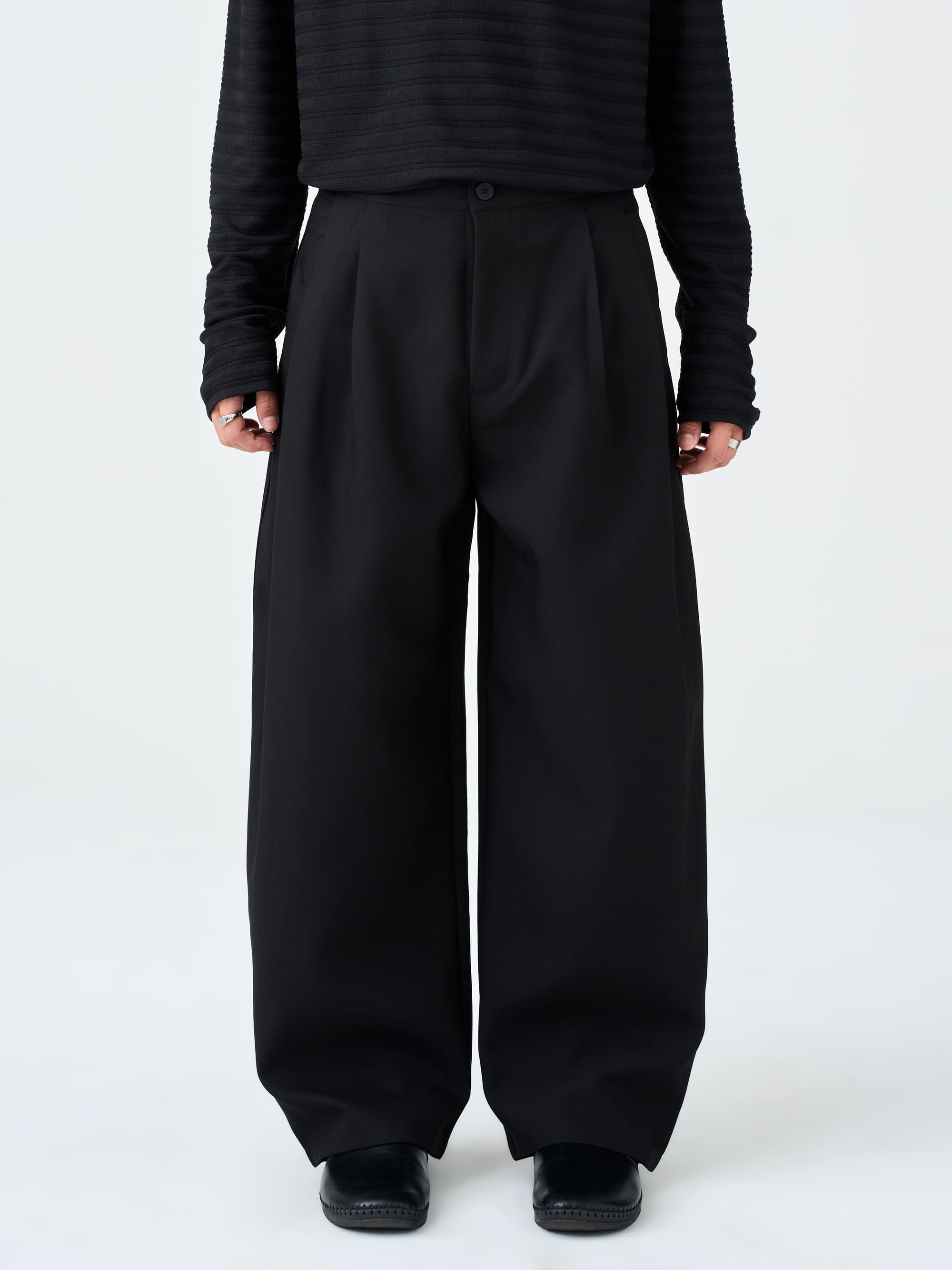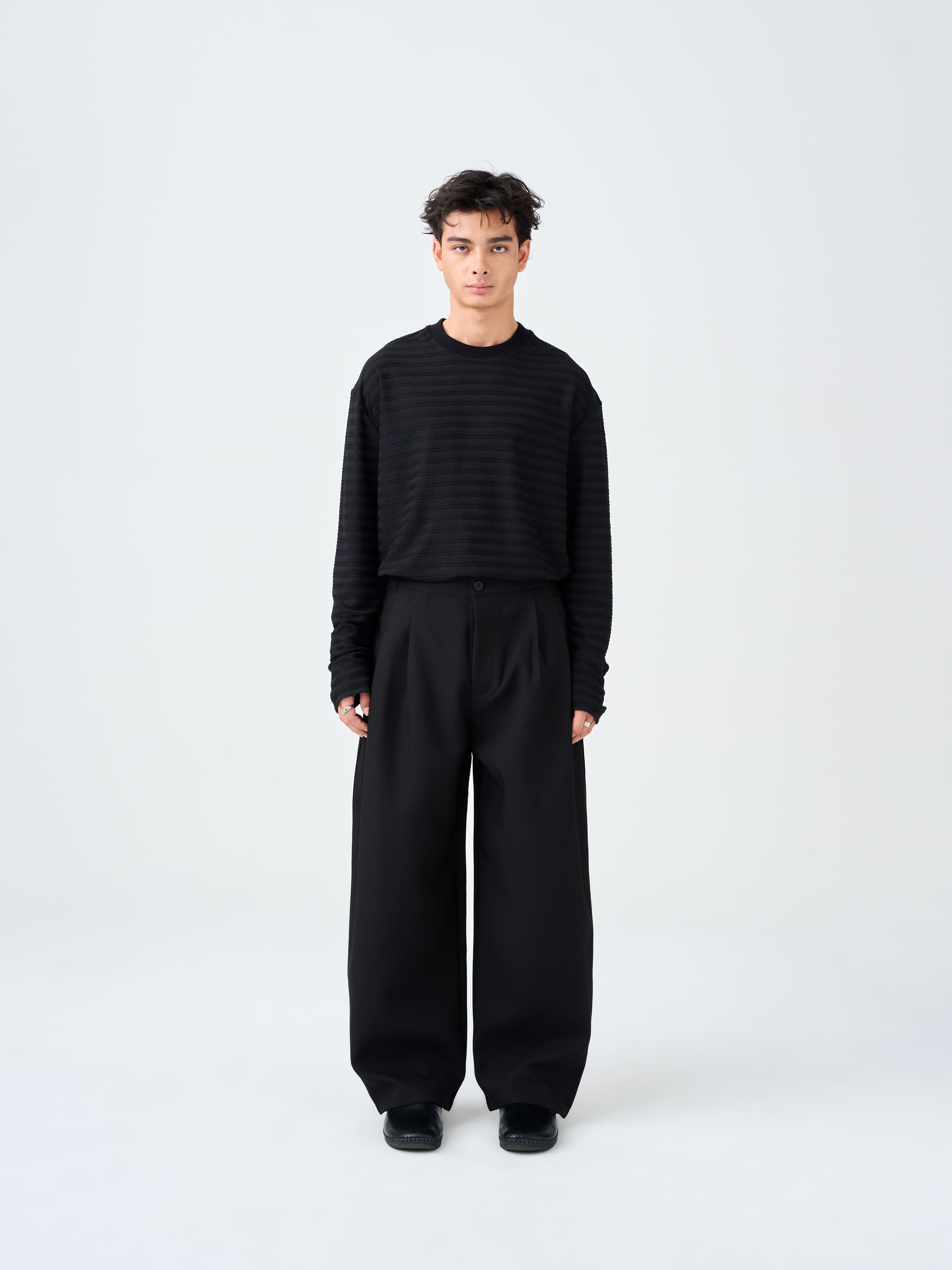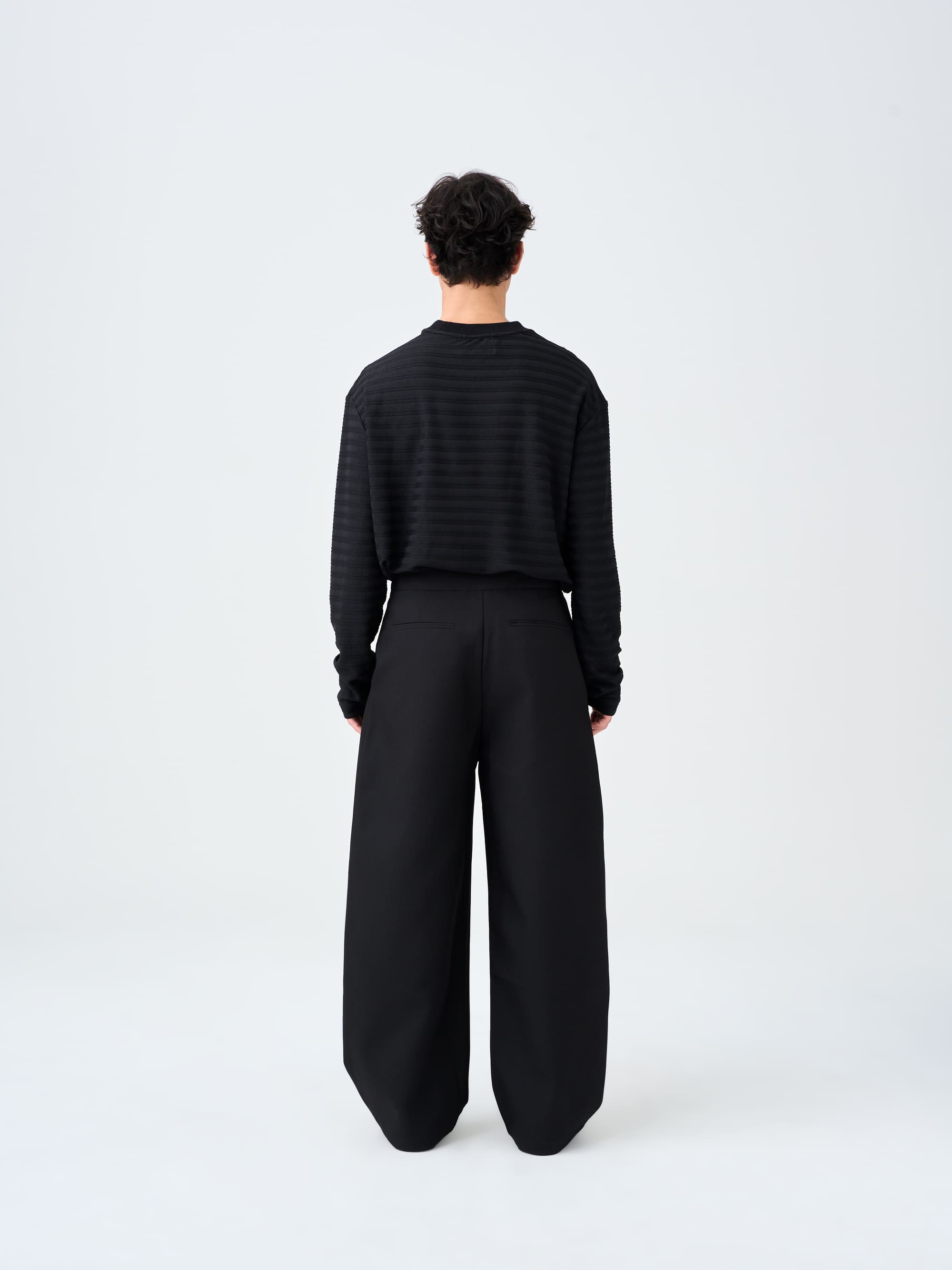 A refined wide-leg silhouette shaped through subtle curvature and controlled volume. Designed to sit naturally on the body, offering ease and quiet structure.